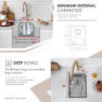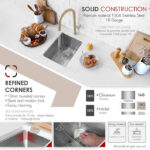 Precisely welded and hand-polished corners, with a sleek 0.4″” radius, enhance cleaning ease and aesthetic appeal. A noise-reducing undercoating over thick rubber pads ensures a remarkably quiet sink while preventing water condensation. Ideal for busy households, its deep design effortlessly accommodates large cookware and discretely conceals dirty dishes.