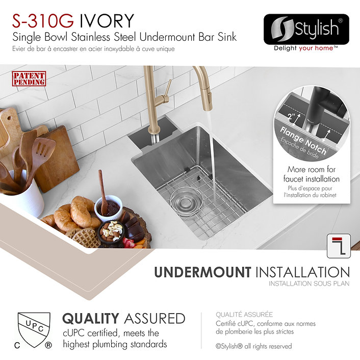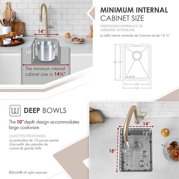 This 14″” x 18″” Undermount Bar Sink, designed in Canada to meet top North American plumbing standards, optimizes space with rear-set drains. Its X-pattern drain grooves ensure efficient drainage. Handcrafted from 18-gauge surgical grade SUS 304 stainless steel, featuring 18% chromium and 10% nickel, it offers superior strength and durability. A satin finish conceals water spots and maintains a uniform patina over time.