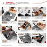 Included are a custom-fit bottom grid for sink protection, a deep stainless steel basket drain strainer for efficient waste capture, plus a cutting template and mounting brackets for straightforward installation.