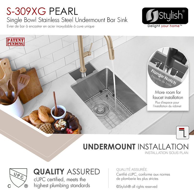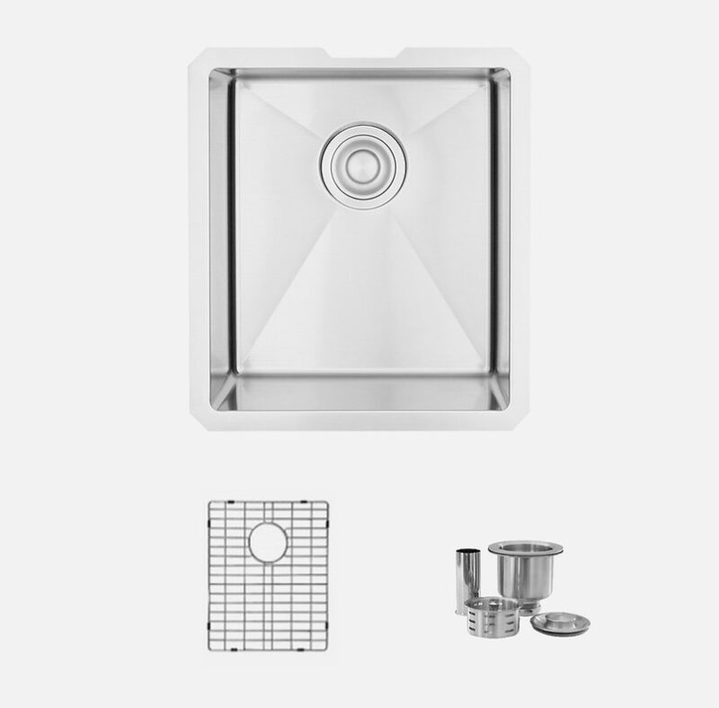 16 in Single Bowl Bar Sink, 16 Gauge Stainless Steel with Grid and Basket Strainer, by Stylish® S-309XG Pearl