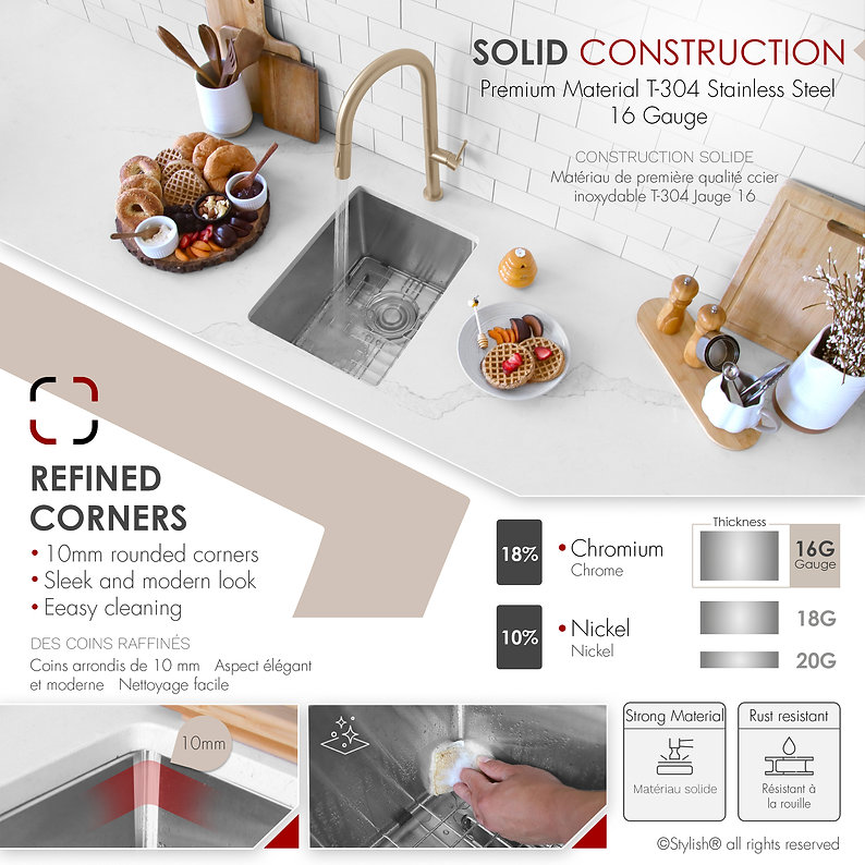 Engineered in Canada, this sink is crafted from premium 304 stainless steel with 18 gauge thickness and 18/10 chrome-nickel content. The high chrome content ensures durability, rust resistance, and a lustrous satin finish, while nickel enhances strength and hardness. A refined brushed finish adds elegance.