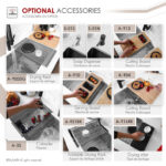 Included accessories—like a luxury basket strainer, cutting template, mounting brackets, and a custom-fit bottom grid—protect the sink from damage. A rear-set drain optimizes storage space under the sink.