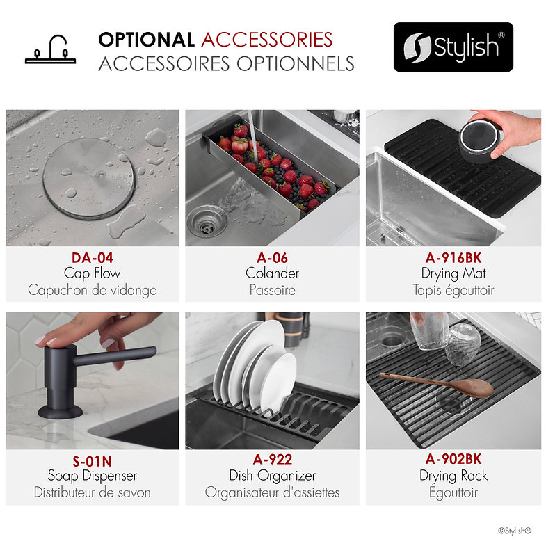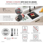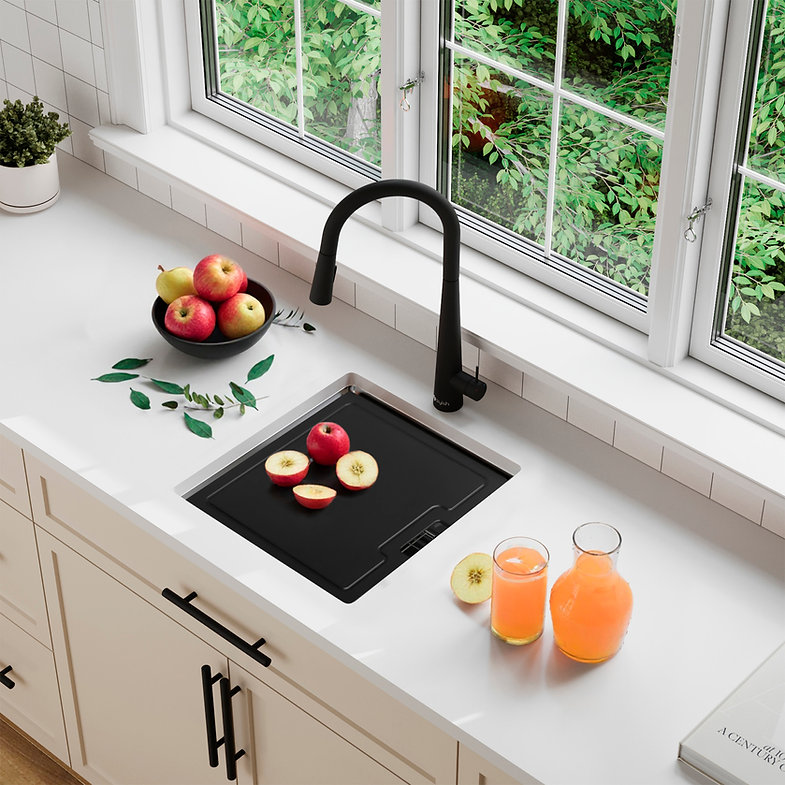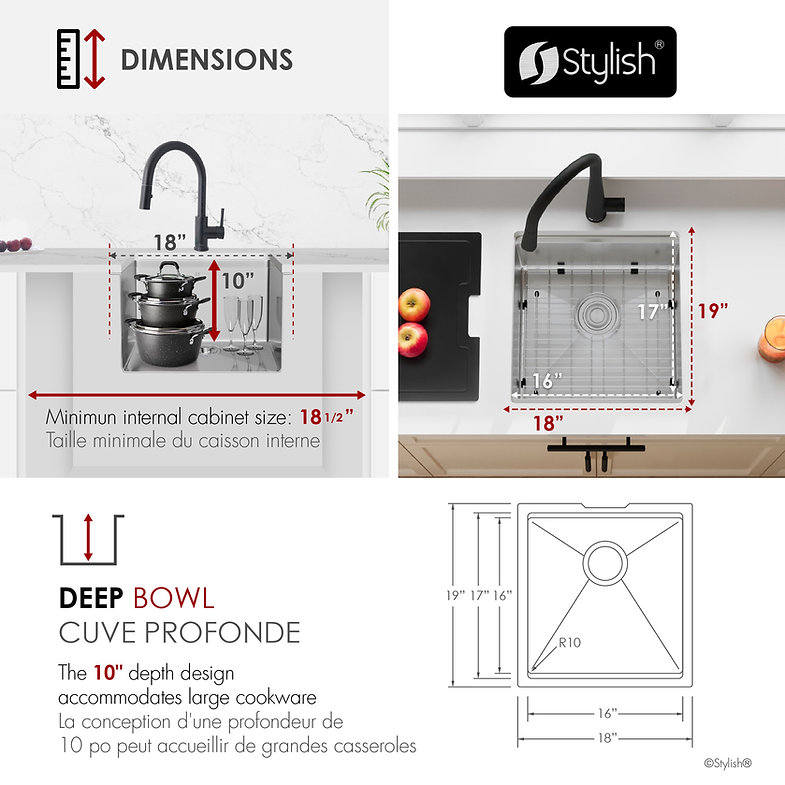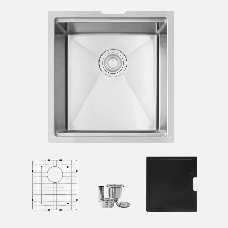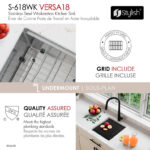 Maximize your kitchen prep with the S-618WK Versa18 workstation sink. Handcrafted from 16‑gauge T‑304 stainless steel, its 18″ × 19″ × 10″ deep single bowl features an integrated ledge on both long sides for sliding tools, a reversible rear‑set drain, and premium soundproofing with thick rubber pads and undercoating. Includes protective stainless steel bottom grid, large black cutting board, and luxury basket strainer. cUPC‑certified and covered by a limited lifetime warranty. Requires minimum 20″ external and 18.5″ internal cabinet width