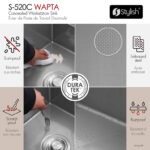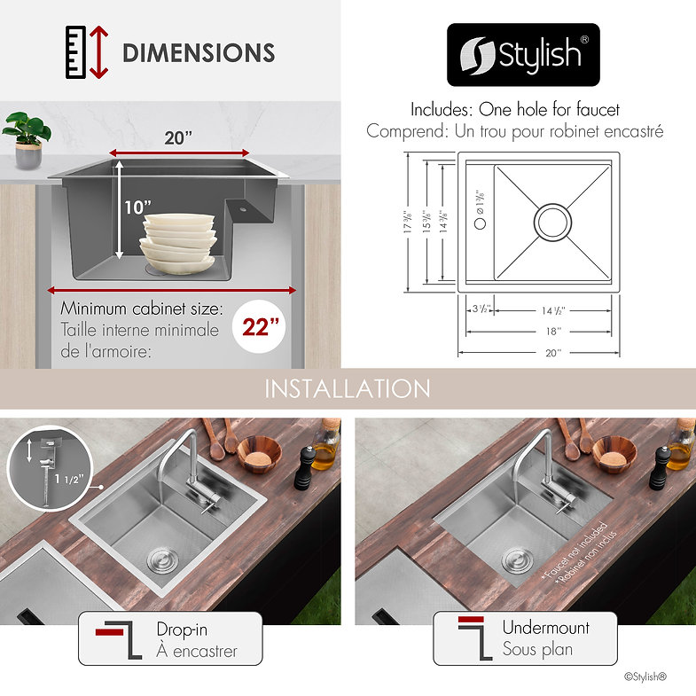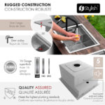 Engineered for toughness, it features a 3mm flange, 16-gauge thick steel, and Sound Guard Pads with coating for noise reduction. This stainless steel sink is cUPC certified to meet North America plumbing standards, Dimensions: 20″ x 17-3/8″ x 10″ with a concealed faucet hole, fitting a minimum 22-inch cabinet. Install as an undermount or drop-in sink to suit your space.