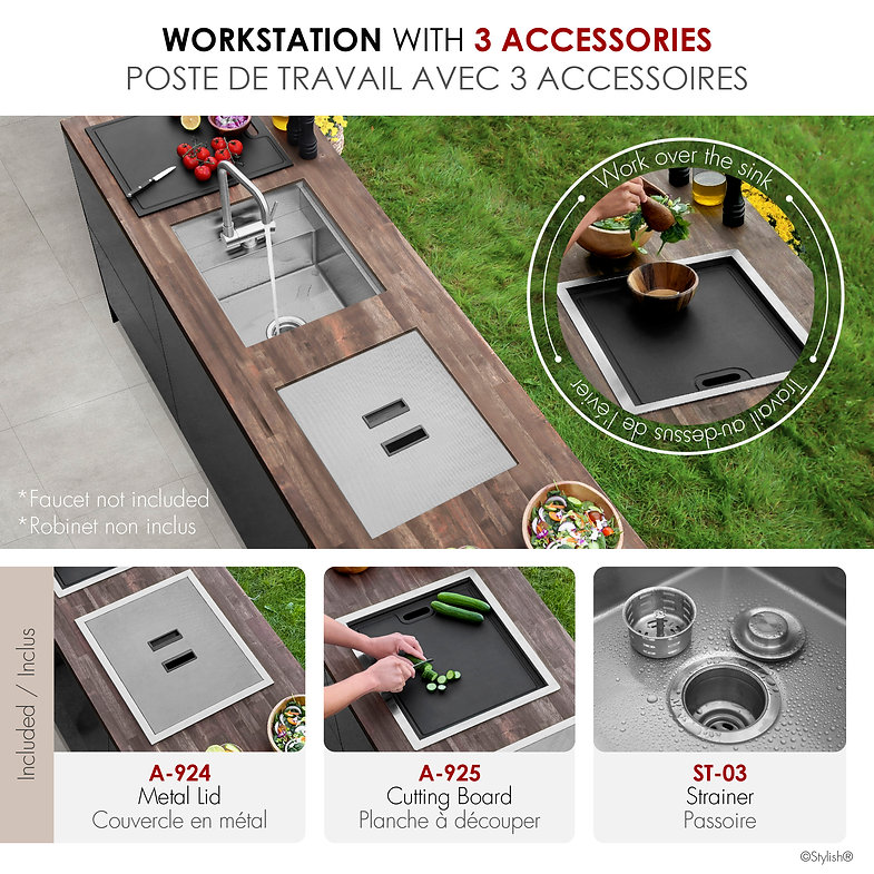 Crafted from embossed stainless steel, this 20 inch single bowl sink is stain-proof, rust-proof, and built to last. It comes with three essential accessories: a metal lid, a luxury basket strainer (ST-03), and a black wood fiber cutting board (A-925). The integrated ledge enables seamless over-the-sink workflow.