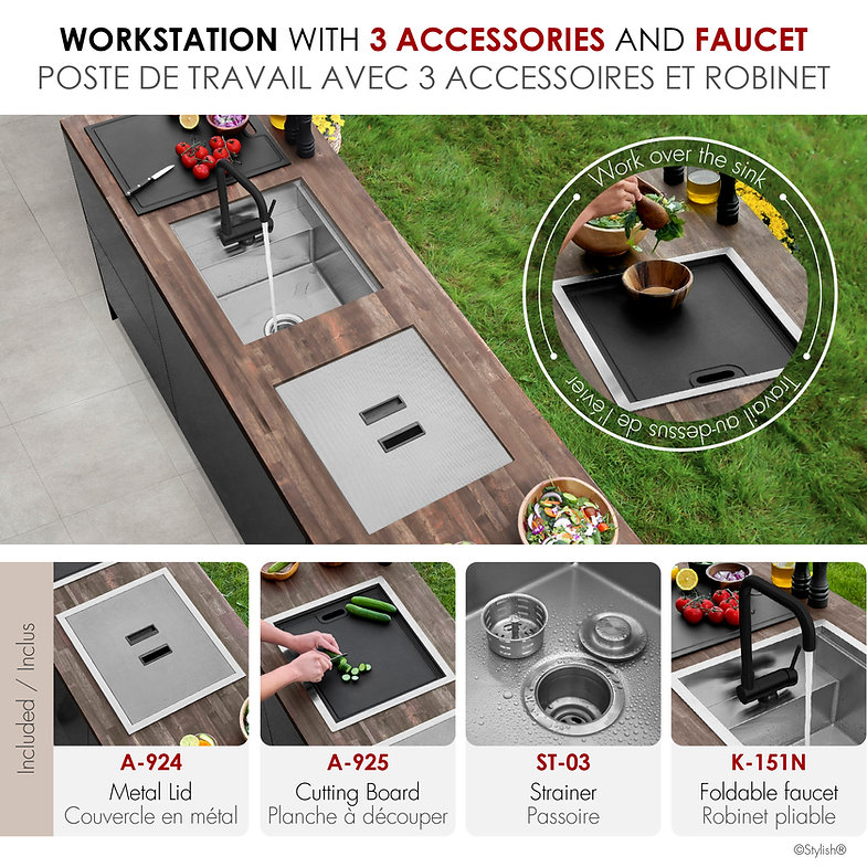 Crafted from embossed stainless steel, this sink is stain-proof, rust-proof, and built to last. It comes with three essential accessories: a metal lid, a luxury basket strainer (ST-03), and a black wood fiber cutting board (A-925). The integrated ledge enables seamless over-the-sink workflow. The foldable Matte Black faucet (K-151N) adds convenience.