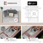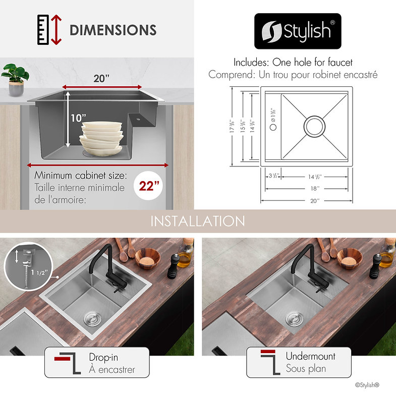 Engineered for toughness, it features a 3mm flange, 16-gauge thick steel, and Sound Guard Pads with coating for noise reduction. The sink is cUPC certified to meet North America plumbing standards, Dimensions: 20″ x 17-3/8″ x 10″ with a concealed faucet hole, fitting a minimum 22-inch cabinet. Install as undermount or drop-in sink to suit your space.