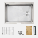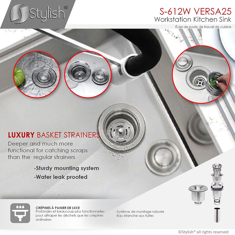 Adding style and functionality to your kitchen has never been easier with the amazing Versa25 kitchen sink workstation which includes one 25”x19” single bowl undermount stainless steel kitchen sink, one protective stainless steel bottom grid, one ledge sink steel-silicone coated drying rack, one perfect fit bamboo cutting board. This workstation sink comes with the ledge on the longer sides of the sink. This ledge allows the kitchen sink accessories to perfectly fit making it a unique and functional experience. The undermount stainless steel kitchen sink features not only a sided set drain, but the drain is also set to the middle, this is a brilliant feature that truly allows maximum space under the kitchen cabinet and you can install the drain to the left or to the right. The Sink bottom is designed with small slope and grooves for efficient water drainage. Another great reason to have this workstation installed is the undermount soundproofing, sink is covered with thick pads on all sides, it is guaranteed to be silent while in use, additionally there is an undermount coating that will protect your kitchen cabinet from condensation. Made from premium material, the Versa25 workstation is handcrafted using super thick 16 gage and premium 304 stainless steel with 18/10 chrome/nickel content and featuring a commercial-grade satin finish to hide marks and scratches and unlike most competitors this sink features gently rounded corners all around to make cleaning as simple as wiping the surface with a damp cloth. This workstation would not be completed without our luxury basket strainer. Also included, the basket strainer is larger and more efficient than regular strainers as it catches food scraps and debris to prevent the drain from getting clogged. For easy installation, all mounting hardware and installation instructions are provided. Our Stylish® and functional single bowl undermount kitchen sink workstation is what your kitchen is missing.