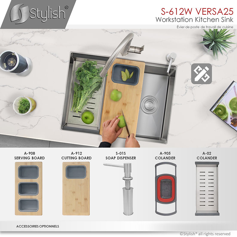 25 inch Workstation Single Bowl Undermount 16 Gauge Stainless Steel Kitchen Sink with Built in Accessories, by Stylish® S-612W Versa25