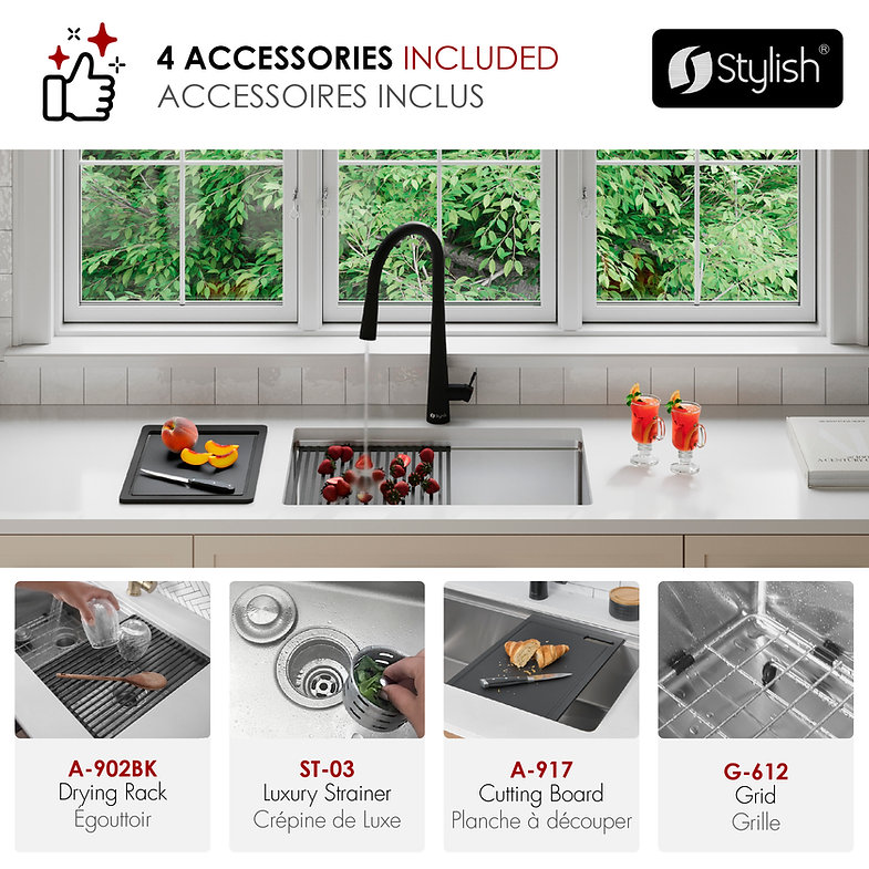 25 inch Workstation Single Bowl Undermount 16 Gauge Stainless Steel Kitchen Sink with Black Accessories included, by Stylish® S-612WK Versa25