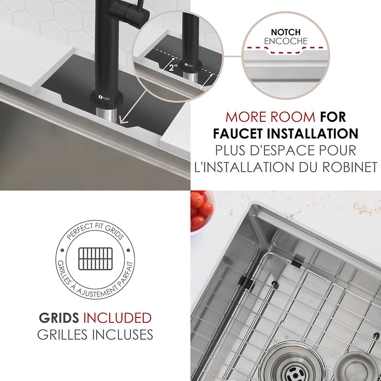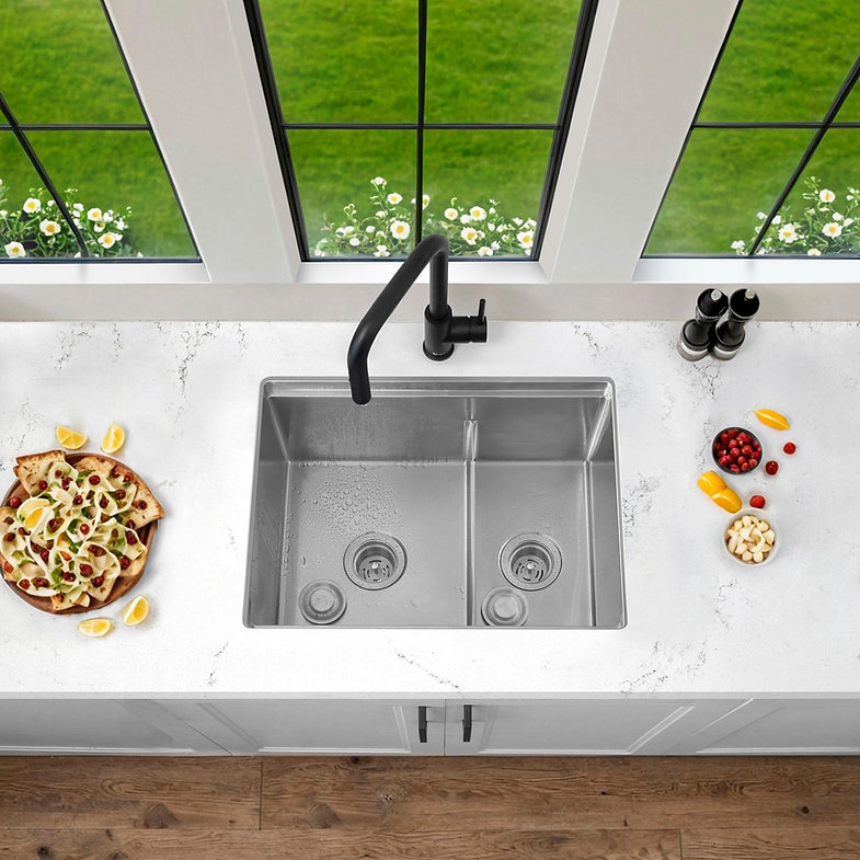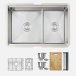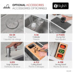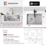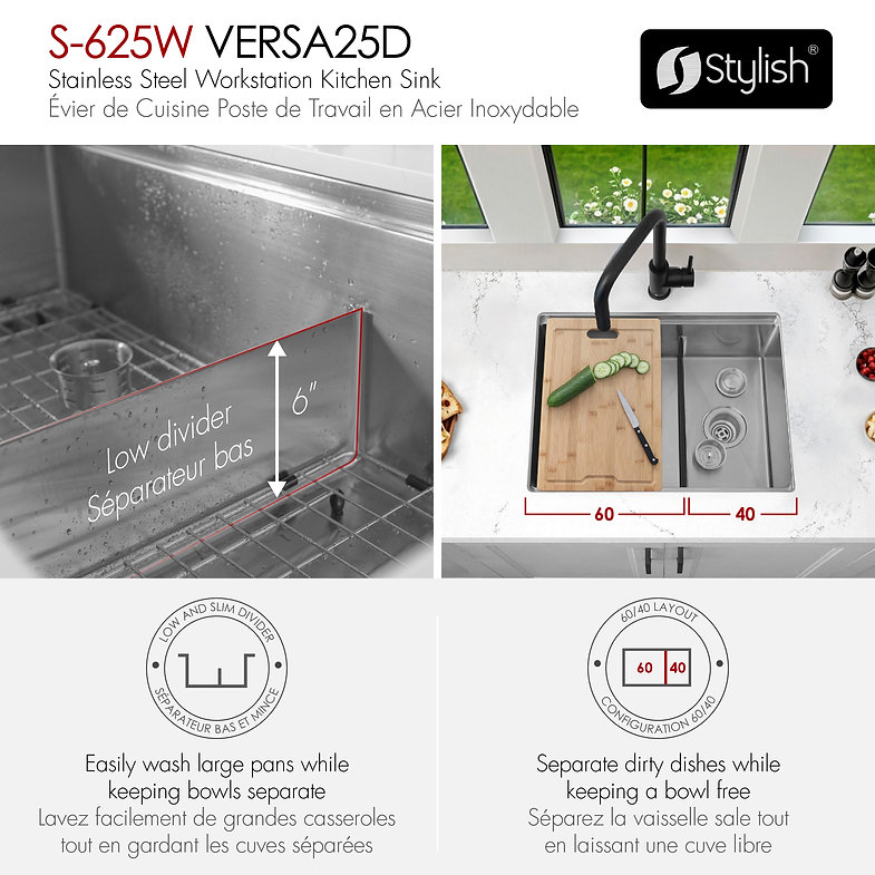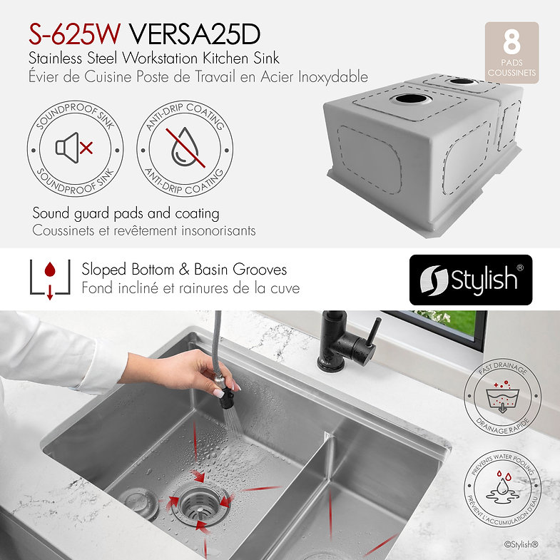 Handcrafted from 16‑gauge T‑304 stainless steel with a satin finish, the 25″×19″×10″ undermount 60/40 double‑bowl S-625 W Versa25 Double features integrated ledges for sliding accessories, reversible large‑bowl orientation, and premium soundproofing with thick rubber pads and undercoating. Includes two stainless steel bottom grids, two luxury basket strainers, a roll‑up drying rack, and a premium bamboo cutting board. cUPC‑certified, disposal‑compatible and backed by a limited lifetime warranty. Requires minimum 25.5″ cabinet opening
