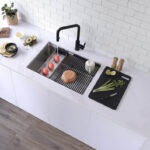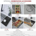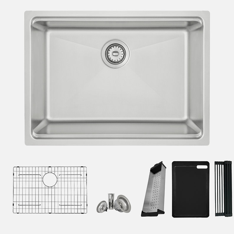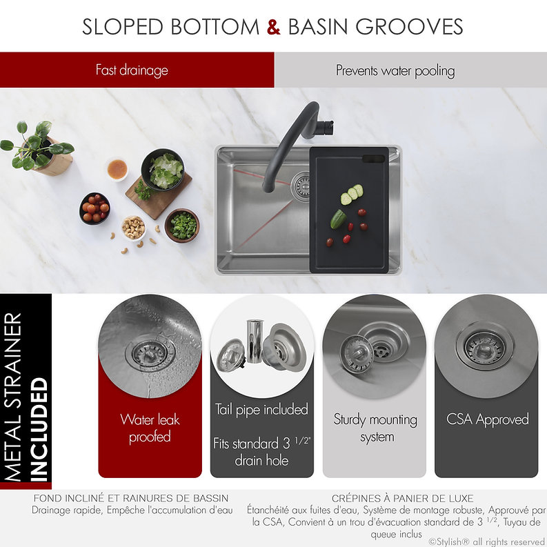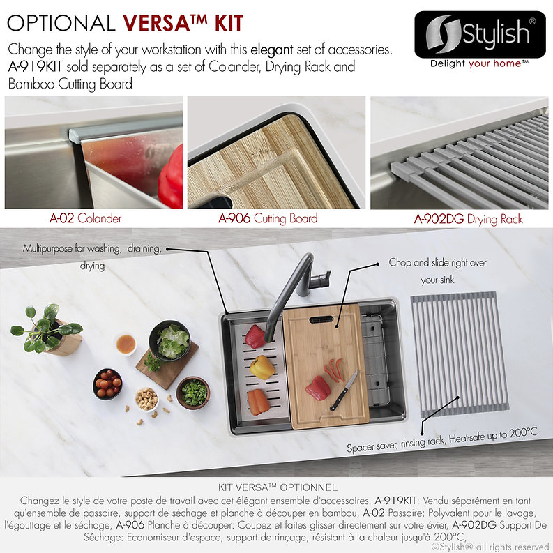 Introducing the new single bowl workstation kitchen sink, a part of the new Stylish® Completo series. This sink is engineered to deliver great functionality, style, and value. This 27-inch workstation includes a set of modern and elegant accessories: one protective stainless-steel bottom grid, one steel silicone-coated black drying rack, one black cutting board and one slim stainless-steel colander. Its ledge on the longer sides of the sink allows the accessories to fit and slide perfectly for efficient use. It features a sloped basin with grooves for fast water drainage and underneath it is covered with insulation pads on all sides for silent use. It also includes extra thick bottom pads that will protect your kitchen cabinet from condensation. This sink is made from premium material, using the thickest 16-gauge T-304 stainless steel with 18/10 chrome/nickel content, and featuring a commercial-grade satin finish to hide marks and scratches. This sink features gently rounded corners all around to make cleaning as simple as wiping the surface with a damp cloth. This sink is designed to be installed as drop-in or undermount, it includes the installation hardware and comes with an all-metal drain strainer.
