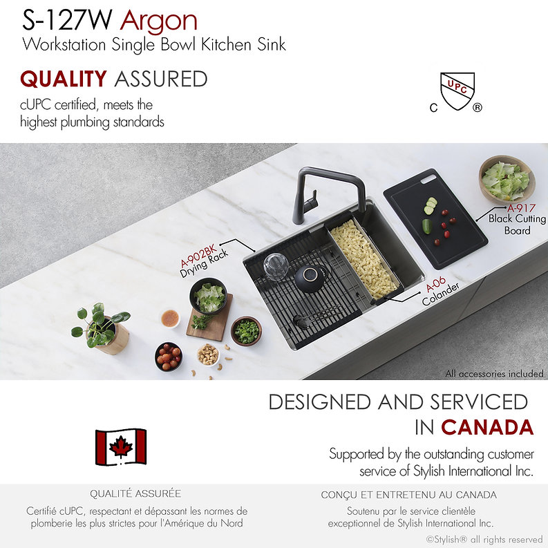 27 inch Workstation Single Bowl Undermount and Drop-in 16 Gauge Stainless Steel Kitchen Sink with Built in Accessories, by Stylish® S-127W Argon