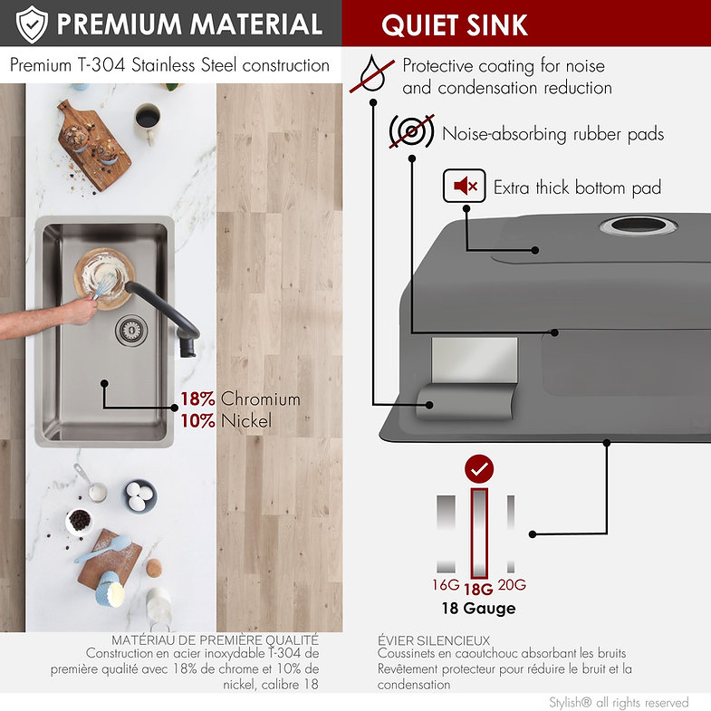 Constructed using premium materials, our sink features a composition of 18% Chromium and 10% Nickel, making it highly resistant to corrosion and stains. The 18-gauge thickness ensures outstanding strength, providing long-lasting performance that withstands the test of time.