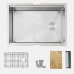 Adding style and functionality to your kitchen has never been easier with the amazing Versa27 kitchen sink workstation which includes one 27”x19” single bowl undermount stainless steel kitchen sink, one protective stainless steel bottom grid, one ledge sink steel-silicone coated drying rack, one perfect fit bamboo cutting board. This workstation sink comes with the ledge on the longer sides of the sink. This ledge allows the kitchen sink accessories to perfectly fit making it a unique and functional experience. The undermount stainless steel kitchen sink features not only a sided set drain, but the drain is also set to the middle, this is a brilliant feature that truly allows maximum space under the kitchen cabinet and you can install the drain to the left or to the right. The Sink bottom is designed with small slope and grooves for efficient water drainage. Another great reason to have this workstation installed is the undermount soundproofing, sink is covered with thick pads on all sides, it is guaranteed to be silent while in use, additionally there is an undermount coating that will protect your kitchen cabinet from condensation.  Made from premium material, the Versa27 workstation is handcrafted using super thick 16 gage and premium 304 stainless steel with 18/10 chrome/nickel content and featuring a commercial-grade satin finish to hide marks and scratches and unlike most competitors this sink features gently rounded corners all around to make cleaning as simple as wiping the surface with a damp cloth. This workstation would not be completed without our luxury basket strainer. Also included, the basket strainer is larger and more efficient than regular strainers as it catches food scraps and debris to prevent the drain from getting clogged. For easy installation, all mounting hardware and installation instructions are provided. Our Stylish® and functional single bowl undermount kitchen sink workstation is what your kitchen is missing.
