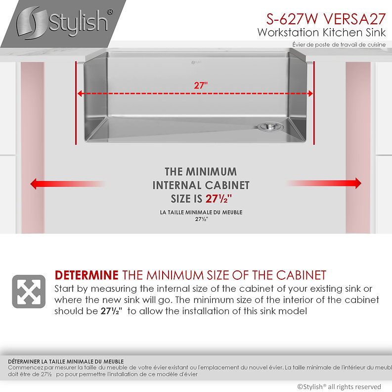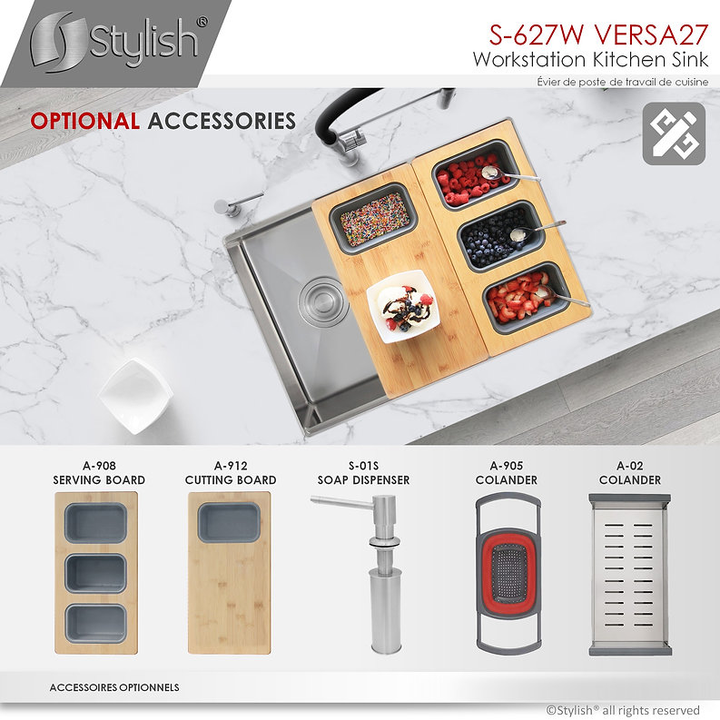 27 inch Workstation Single Bowl Undermount 16 Gauge Stainless Steel Kitchen Sink with Built in Accessories, by Stylish® S-627W Versa27