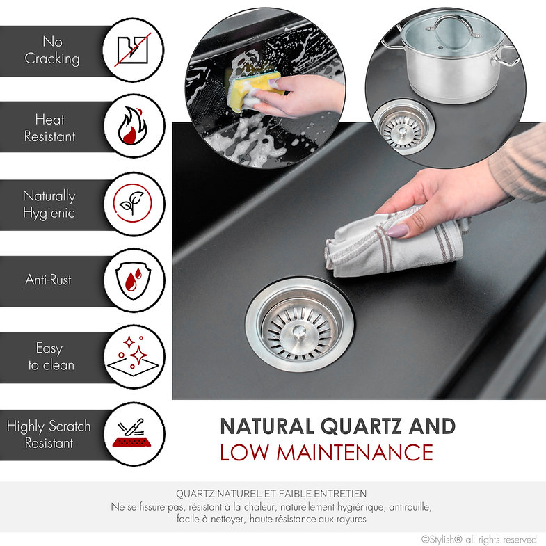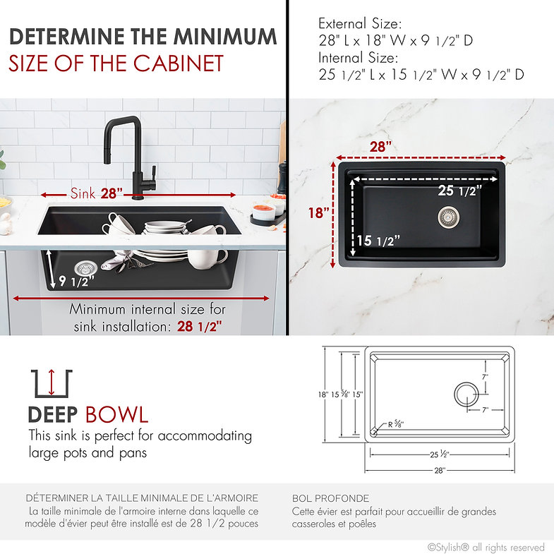 A clever and modern design are part of this stunning composite granite workstation kitchen sink. Rock your kitchen experience with the included standard strainer, roll-up drying rack, stainless steel colander and perfect fit bamboo cutting board. This amazing 28-inch single bowl dual mount composite granite kitchen sink is made with 80% natural quartz which makes this sink exceptionally durable and low-maintenance, with a stone-like material that is much lighter than solid granite, but still great for the challenge of handling your everyday demands. If that wasn’t enough, it has been cleverly designed with a ledge that allows the kitchen sink accessories to perfectly fit on top of the kitchen sink saving space on the kitchen countertop. This single bowl granite kitchen sink is highly resistant to dirt and grime, very easy to clean and maintain. It is designed to be dual mount. It can be Installed over the countertop or as an undermount sink for a more seamless appearance. A deep 9.5-inch bowl gives plenty of room for larger pots and pans. The thick granite material eliminates vibration and noise when the sink is in use, making it exceptionally quiet. The drain has been placed to the side centre with a gently slopped bottom to allow for easy drainage and prevent standing water in the single bowl. This composite granite kitchen sink has also been designed with a reversible installation, the sink can be flipped around to choose whether the drain is on the left or right, giving you the freedom to choose what is convenient for you and the plumbing in your kitchen. Available in three beautiful colors, Black, Gray and White, this composite granite kitchen sink will not fade, the color penetrates through the entire surface allowing for the color to last a lifetime. Also Included with this single bowl composite granite kitchen sink are installation instructions and mounting hardware for your convenience. Clean lines and simple shapes define this stunning workstation kitchen sink. Modernize your kitchen and create an uninterrupted workspace with this amazing composite granite workstation kitchen sink.