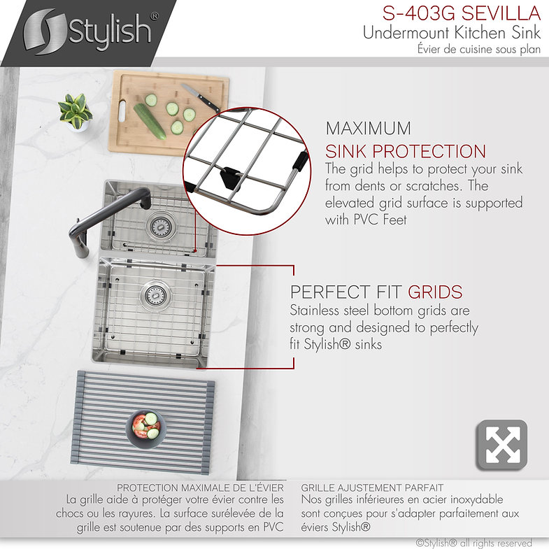 28 in Undermount Double Bowl Kitchen Sink, 18 Gauge Stainless Steel with Grids and Standard Strainers , by Stylish® S-403G Sevilla
