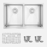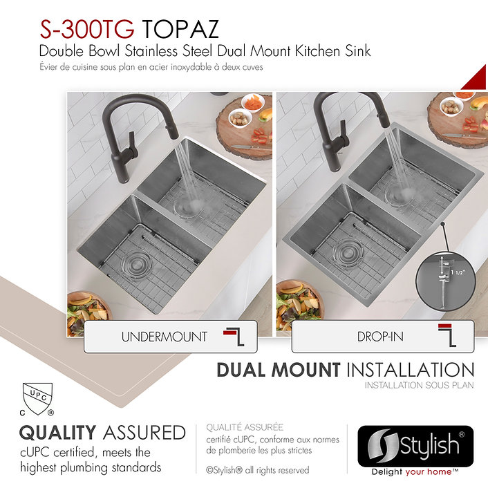Transform your kitchen with the stylish Canadian-designed STYLISH 30” x 18” stainless steel sink, ideal for drop-in or undermount installation. This versatile sink features 10-inch deep double bowls, luxury basket strainers, a cutting template, mounting brackets, and stainless steel bottom grids for added functionality and elegance.