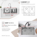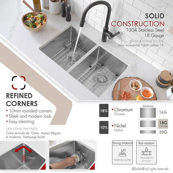 Crafted from 18-gauge T-304 grade stainless steel with 18:10 Nickel: Chromium content, it ensures rust and corrosion resistance. The modern linear design includes rectangular bowls with 10mm tight radius corners, facilitating easy cleaning. Heavy-duty sound guard padding and spray coating on all sides provide sound insulation and thermal protection against condensation.