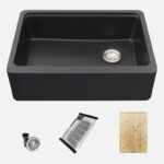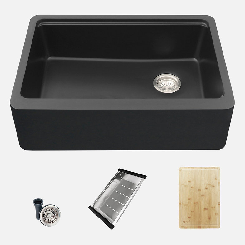 A clever and modern design is part of this stunning composite granite apron workstation kitchen sink. Rock your kitchen experience with the included standard strainer, metal colander, and perfect-fit cutting board. This amazing 30-inch single bowl under-mount composite granite apron sink is made with 80% natural quartz, making this stone-like sink exceptionally durable and low maintenance. This sink material is great for handling your everyday demands. If that was not enough, it has been cleverly designed with a ledge that allows the kitchen sink accessories to perfectly fit on top of the kitchen sink saving space and adding functionality. This single-bowl granite apron kitchen sink is highly resistant to dirt and scratches and easy to clean and maintain. It is designed to be an under mount but can be installed as a flush mount as well. It is recommended to be installed as under mount for a more seamless appearance. A deep 10-inch bowl gives plenty of room for larger pots and pans. The thick granite material eliminates vibration and noise when the sink is in use, making it exceptionally quiet. The drain has been placed to the side to provide more space under the sink cabinet, sink is designed with a gently sloped bottom for easy water drainage. Available in three beautiful colors, Black, Gray, and White, this composite granite apron kitchen sink will not fade, the color penetrates through the entire surface allowing for the color to last a lifetime.