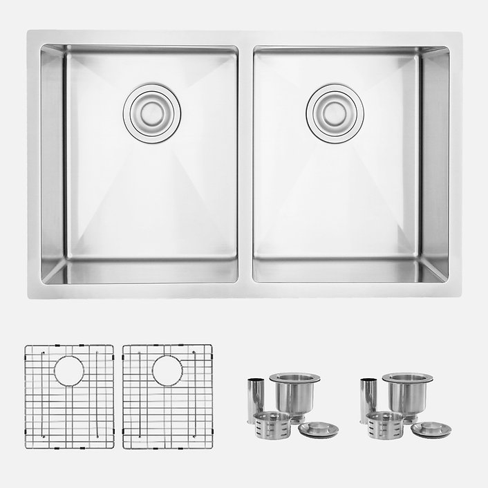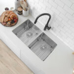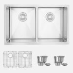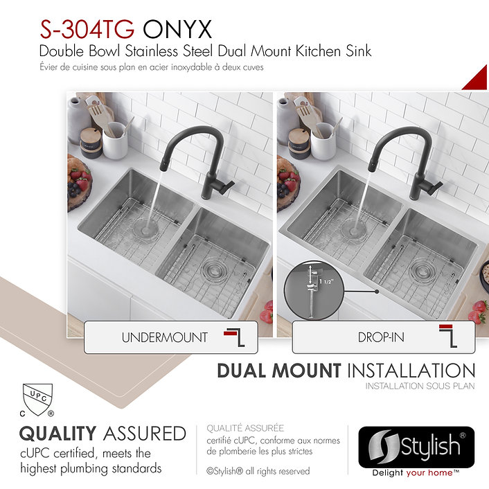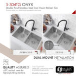 Enhance your kitchen with the Canadian-designed S-304TG sink. This versatile 30″x18″ stainless steel kitchen sink supports both drop-in and undermount installations. It features a 10-inch deep double bowl, two luxury basket strainers, a cutting template, mounting brackets, and two stainless steel protective bottom grids, offering both style and functionality. Crafted from 18 Gauge T-304 grade stainless steel with 18:10 Nickel: Chromium content, this sink is rust-resistant and durable. Its modern, linear design includes rectangular bowls with 10mm tight radius corners for easy cleaning. The sink also has thick, heavy-duty sound guard padding and spray-coating on all sides for superior noise and thermal insulation.The interior boasts a commercial-grade brushed finish, ensuring a uniform patina as the sink ages. This double bowl sink is perfect for any kitchen space, providing both elegance and practicality. Enjoy the blend of style and performance with this premium stainless steel sink.