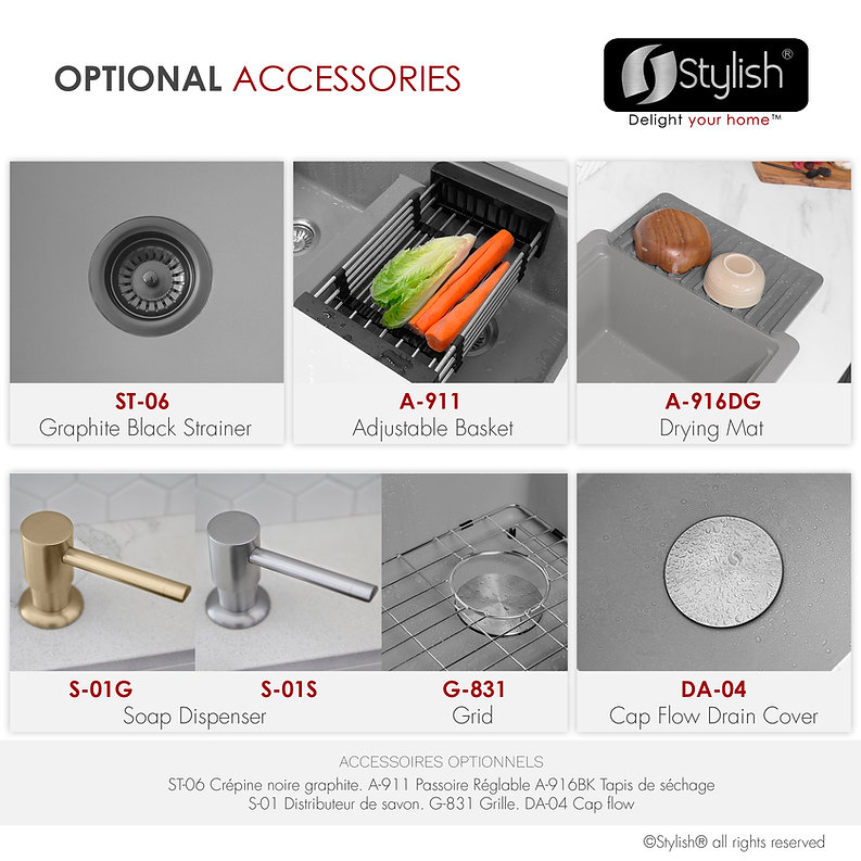 Transform your sink into a versatile culinary workstation with the five included accessories: colander, metal colander, drainer and cutting board. These accessories offer endless possibilities for culinary creativity at your fingertips.