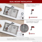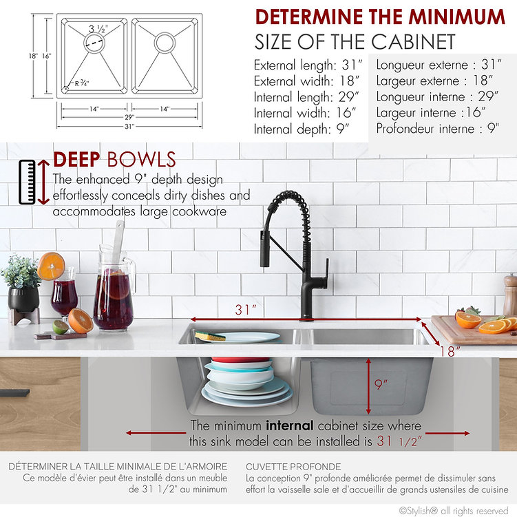 Presenting our premium T-304 Stainless Steel Sink, meticulously crafted to bring functionality to your kitchen. With an exceptional blend of style and durability, this sink is designed to elevate your culinary experience. Constructed using premium materials, our sink features a composition of 18% Chromium and 10% Nickel, making it highly resistant to corrosion and stains. The 16-gauge thickness ensures outstanding strength, providing long-lasting performance that withstands the test of time. With a modern aesthetic, the sink boasts a sleek design and 20 mm radius corners, adding a touch of elegance to any kitchen decor. This 31-inch sink provides ample space for all your washing and prep needs. It has a dual-mount design installation, giving you the freedom to choose between under-mount or drop-in configurations.