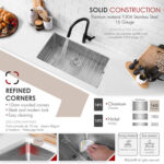 The 10mm radius corners are machine-buffed and hand-polished. This sink includes a bottom grid with protective bumpers to prevent dents and scratches, a soundproofing system with stone guard coating and rubber pads, and a luxury basket drain strainer.