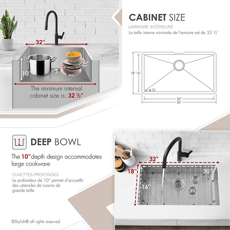 The 32” x 18” handmade stainless steel undermount kitchen sink offers quality and affordability. Ideal for any kitchen, it’s crafted from 16 gauge T-304 stainless steel with 18% chromium and 10% nickel content for strength and hardness. The satin finish hides water spots and maintains a uniform patina. Its extra-deep basin accommodates large pots and pans while concealing dirty dishes.