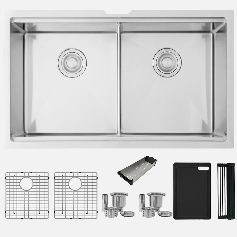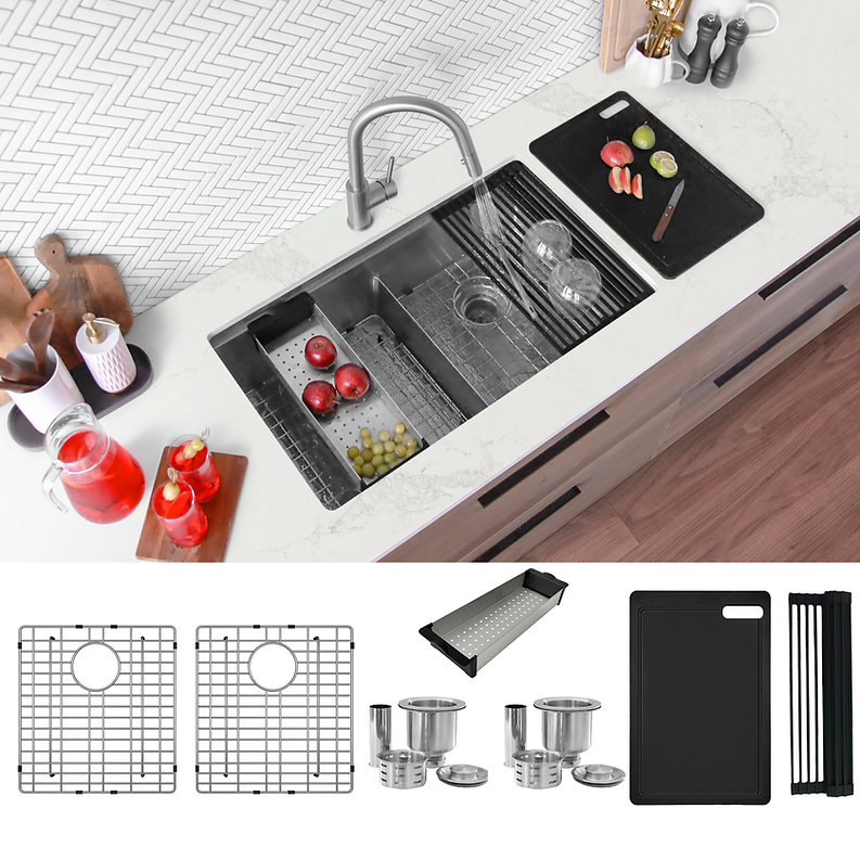 Undermount 32 inch Stainless Steel Double Bowl Workstation Sink with Black Accessories, by Stylish® S-601WK Versa32