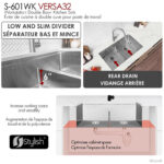 The VERSA kitchen sink combines a stainless steel double bowl with a slim, low divider for optimal space use and functionality. Built-in accessories, including the Black Kit A-918 (colander, roll-up drying rack, and cutting board), slide on integrated tracks to streamline meal prep and cleanup without sacrificing countertop space.