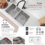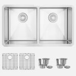 Enhance your kitchen with this 32″x18″ Double Basin Undermount Kitchen Sink. Made from 18 gauge stainless steel, it features a soundproofing system with a Stone Guard coating and thick rubber pads to minimize noise and prevent water condensation. Designed in Canada to meet North American plumbing standards, it includes luxury basket drain strainers that capture food scraps efficiently and rear-positioned drains to maximize under-sink space. The X-pattern grooves improve drainage efficiency. Crafted from surgical grade T 304 stainless steel, the sink has a durable satin finish that conceals water spots and maintains a uniform patina. Its extra-deep basins easily accommodate large pots and pans while keeping dirty dishes hidden. With 18% chromium and 10% nickel content, this sink offers excellent strength and hardness. This modern rectangular sink fits various kitchen designs, combining functionality, quality, and luxury. Discover superior craftsmanship with this premium undermount kitchen sink.