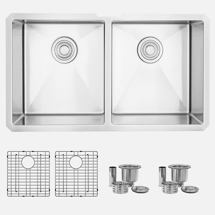 32 in Double Bowl Kitchen Sink, 18 Gauge Stainless Steel with Grids and Basket Strainers, by Stylish® S-301G Zircon