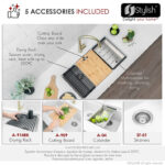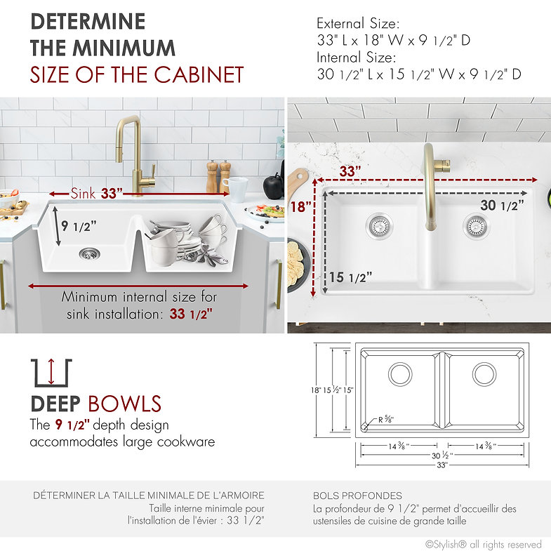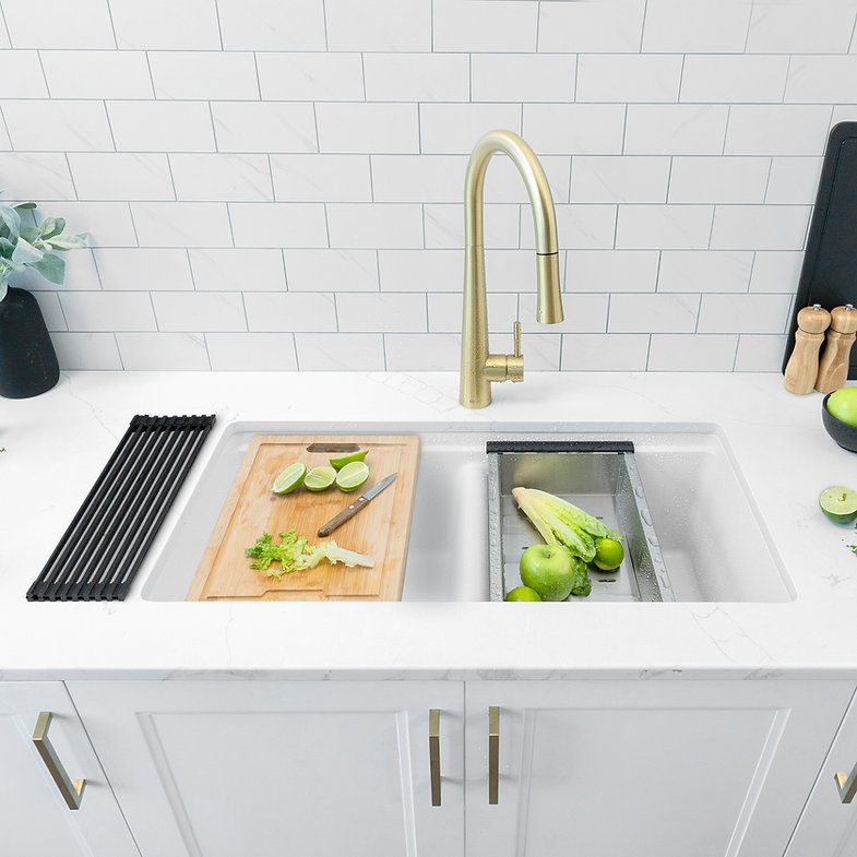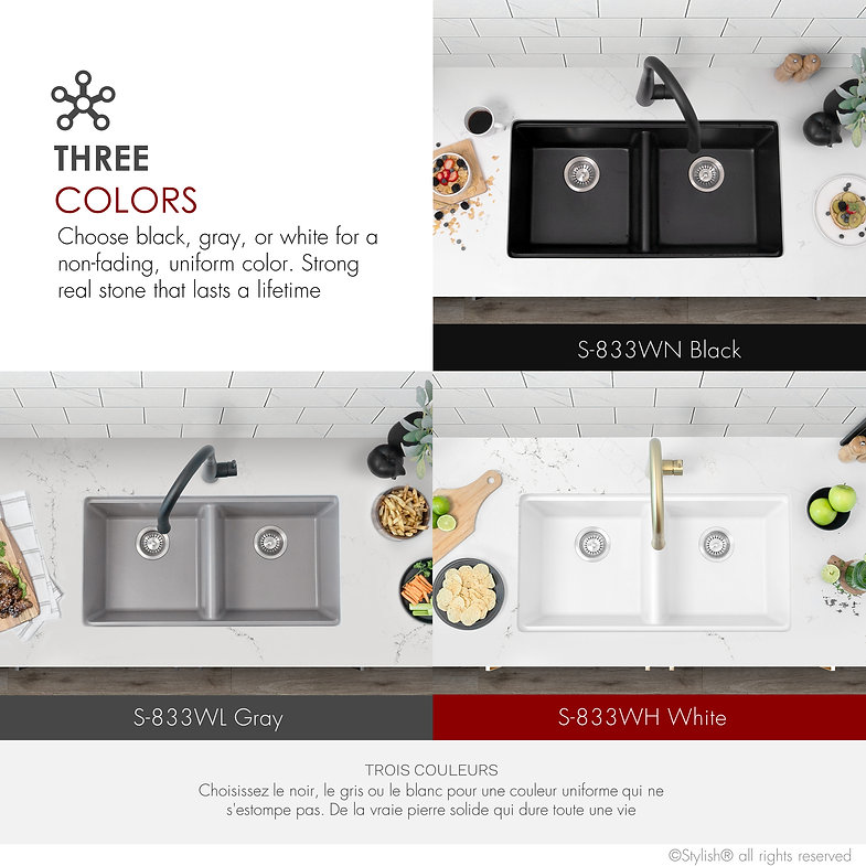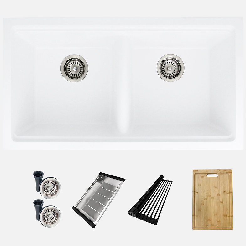 A clever and modern design are part of this stunning granite workstation kitchen sink. Rock your kitchen experience with the included standard strainers, roll-up drying rack, stainless steel colander and perfect fit bamboo cutting board. This amazing 33-inch double bowl dual mount composite granite kitchen sink is made with 80% natural quartz which makes this sink exceptionally durable and low-maintenance, with a stone-like material that is much lighter than solid granite, but still great for the challenge of handling your everyday demands. It has been cleverly designed with a ledge that allows the kitchen sink accessories to perfectly fit on top of the kitchen sink saving space on the kitchen countertop. This double bowl granite kitchen sink is highly resistant to dirt and grime, very easy to clean and maintain. It is designed to be dual mount. It can be Installed over the countertop or as an undermount sink for a more seamless appearance. The deep 9.5-inch bowls give plenty of room to fit larger pots and pans and contain the splashing of water. The thick granite material eliminates vibration and noise when the sink is in use, making it exceptionally quiet. The drains have been placed to the rear centre with a gently slopped bottom to allow for easy drainage and prevent standing water in the sink bowls. Available in three beautiful colors, Black, Gray and White, this composite granite kitchen sink will not fade, the color penetrates through the entire surface allowing for the color to last a lifetime. Also Included with this double bowl workstation composite granite kitchen sinks are installation instructions and mounting hardware for your convenience. Clean lines and simple shapes define this stunning workstation kitchen sink. Modernize your kitchen and create an uninterrupted workspace with this amazing double bowl composite granite workstation kitchen sink.