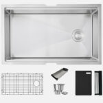 Presenting the Versa33 kitchen sink. This stainless steel sink blends style and functionality seamlessly. Measuring 33″ x 19″, it’s designed for undermount installation and comes with a stainless steel bottom grid, a black silicone-coated drying rack, a custom-fit black cutting board, a stainless steel colander, and a luxury basket strainer. Its unique ledge design allows accessories to fit perfectly, enhancing functionality. The sloped bottom with grooves ensures efficient water drainage, and the side drain maximizes cabinet space. Reversible installation allows for left or right-side drain placement. Crafted from premium 304 stainless steel with 16-gauge thickness, it’s durable and scratch-resistant. Rounded corners make cleaning a breeze. Includes a deep basket strainer to prevent clogs. Mounting hardware and installation instructions are provided.