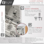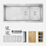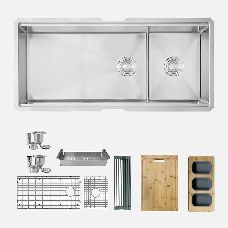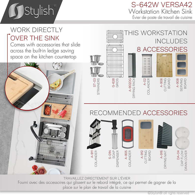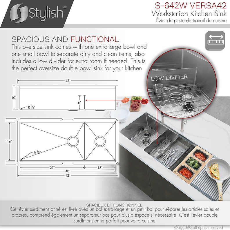 Adding style and functionality to your kitchen has never been easier with the amazing Versa42 kitchen sink workstation. This 42-inch under-mount 70/30 double bowl stainless steel kitchen sink includes one steel-silicone coated drying rack, one bamboo cutting board, one colander, one serving board, two protective stainless steel bottom grids, and two luxury basket strainers. This workstation sink has an integrated ledge that allows the kitchen sink accessories to perfectly fit and slide on the ledge, making it very functional and versatile. The bowl bottoms are designed with a small slope and grooves for efficient water drainage. This large sink is designed a low divider to allow accessories to slide across and provide even more space, It is the perfect sink for a large kitchen. The sink is reversible, it can be installed with the large bowl to the left or to the right as per your preference. This workstation is covered with thick pads on all sides which ensure that it is quiet while in use. Made from premium material, the Versa42 workstation is handcrafted from super thick 16 gauge and premium 304 stainless steel with 18/10 chrome/nickel content, with a commercial-grade satin finish to hide marks and scratches. Unlike most competitors, this sink features smooth rounded corners all the way to match stone cut-out corners and for easy cleaning. This sink includes basket strainers which are deeper and more efficient to catch food scraps and debris to prevent the drain from getting clogged. Al mounting hardware and installation instructions are provided. Our Stylish® chef chef-style workstation double bowl 70/30 under-mount kitchen sink workstation is what your kitchen is missing.