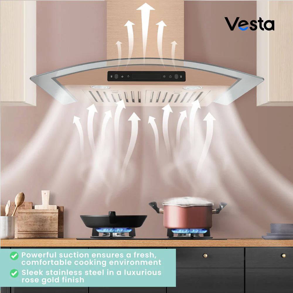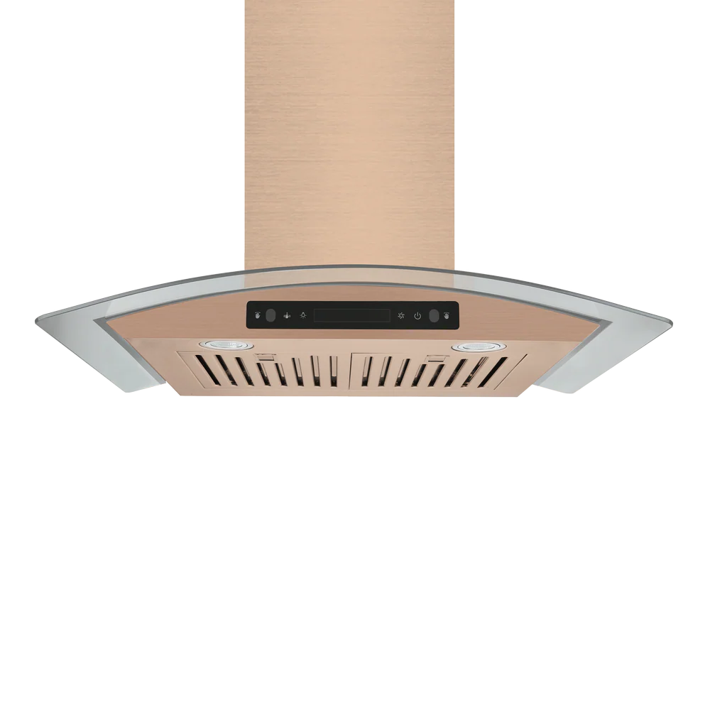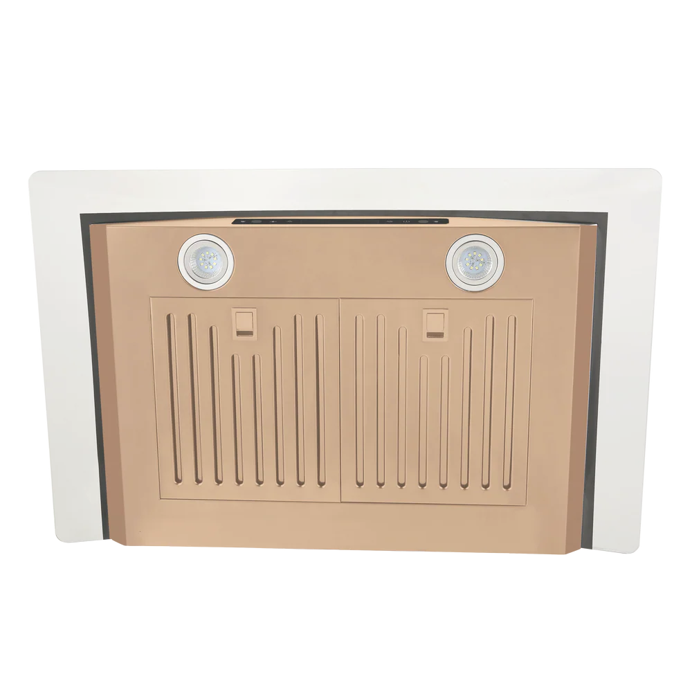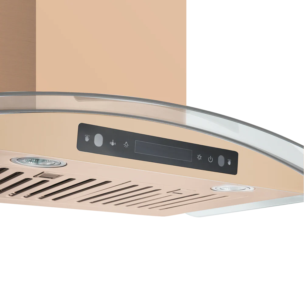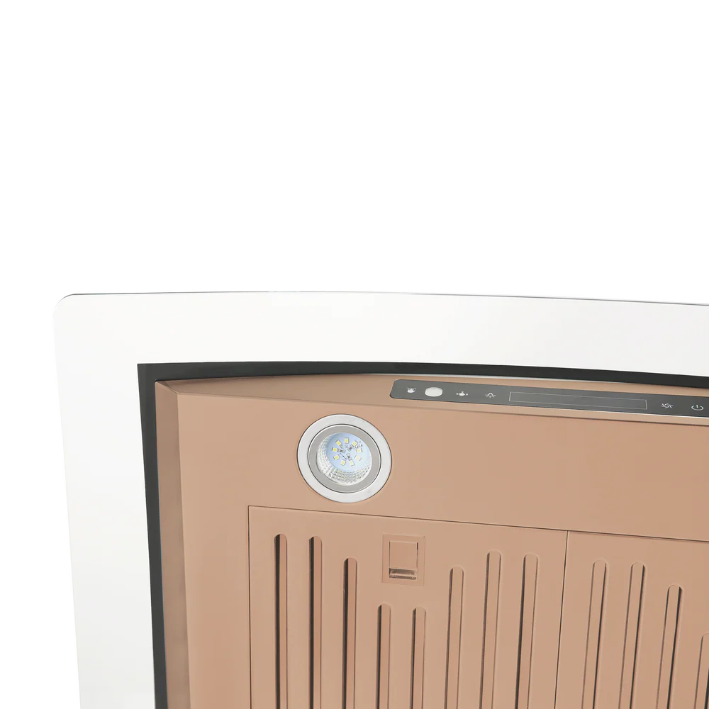 Vesta’s Amsterdam 30-inch rose gold stainless steel wall-mounted range hood is a durable companion for your kitchen. Featuring an ultra strong motor, a touchscreen panel, two baffle filters, a glass canopy, and two LED lights, this unit will elevate your cooking experience to new heights. Here’s what makes it exceptional: