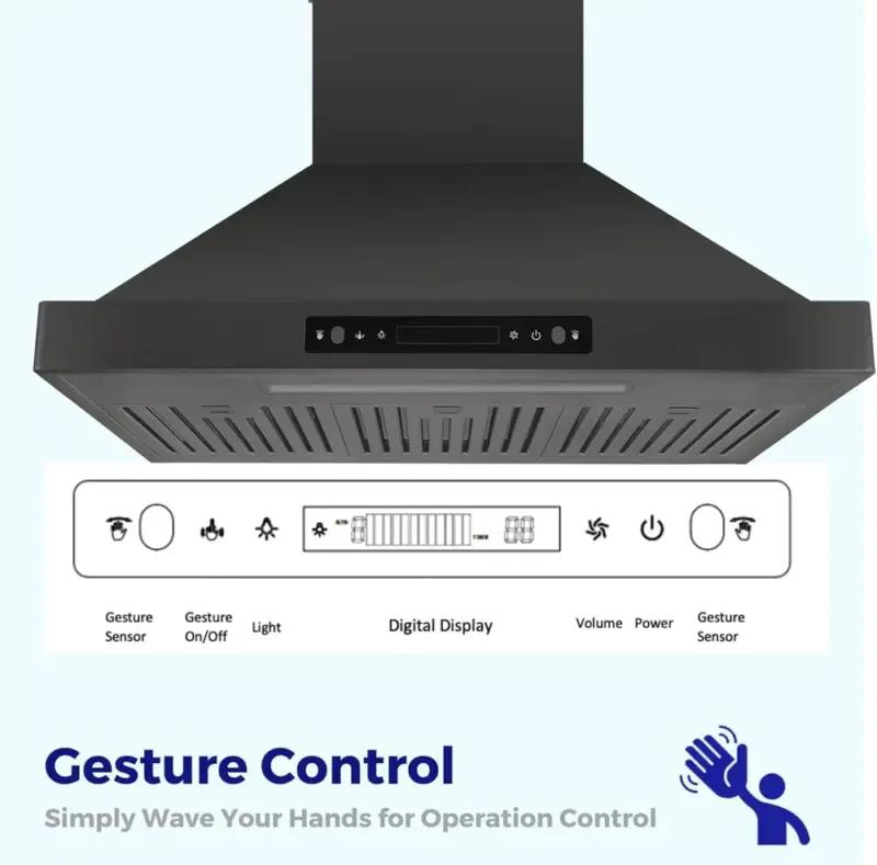 • Strong Suction, High Efficiency: Engineered with an advanced turbo motor design, this premium black stainless steel range hood delivers exceptional 800 CFM suction power. Its durable, anti-corrosive construction ensures long-lasting performance while efficiently removing smoke and odors.