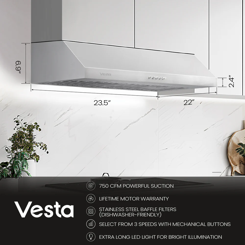 ✅ 750 CFM POWERFUL SUCTION WITH EASY CONTROLS: Experience powerful 750 CFM (cubic feet per minute) suction with this Vesta range hood. Efficiently eliminate smoke and odors, and easily adjust the fan speed with user-friendly mechanical push buttons.