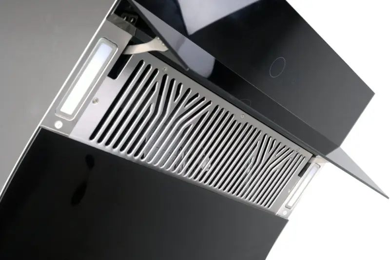 UNIQUE DESIGN: This new range hood utilizes a 90° automatic open baffle plate for advanced side draft filtration, reducing the dispersion of cooking fumes and odors while enhancing airflow by quickly filtering up to 6 square feet of space.