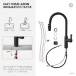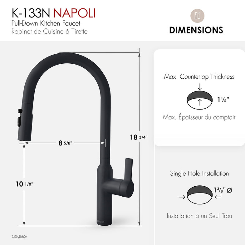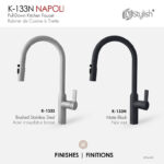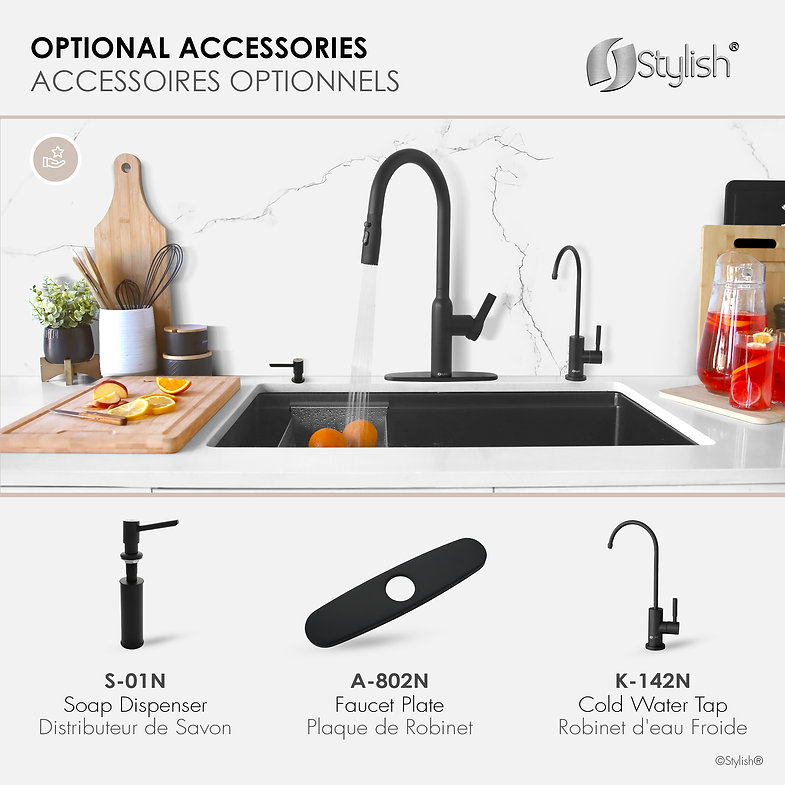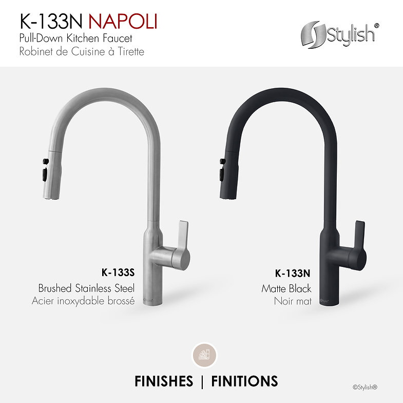 This beautiful and modern kitchen faucet comes in two finishes, brushed stainless steel and matte black, choose the finish that best matches your kitchen decor.