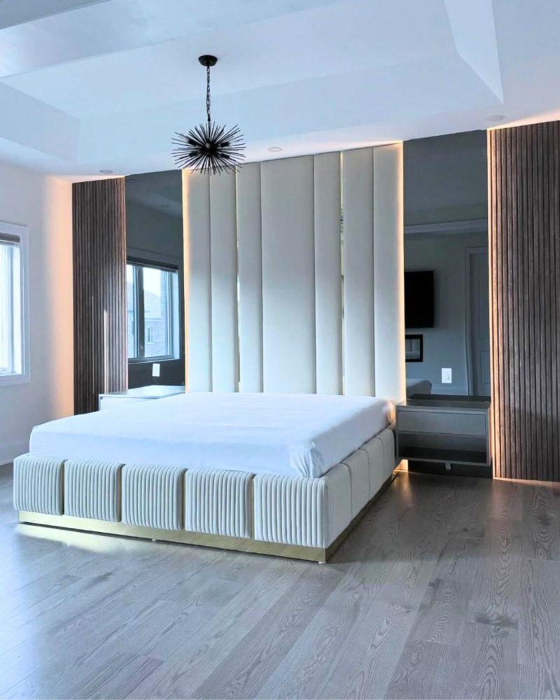 This custom-designed bed blends modern elegance with architectural detail, creating a sophisticated centerpiece for the bedroom. The floor-to-ceiling upholstered headboard panels add depth and visual balance, while integrated LED backlighting provides a soft ambient glow that enhances the room’s atmosphere.