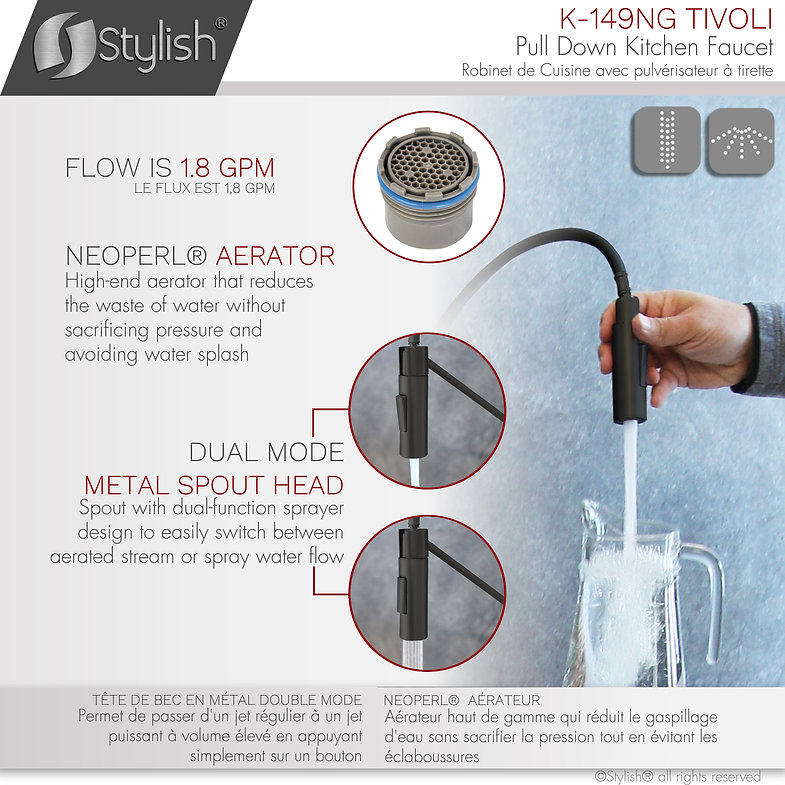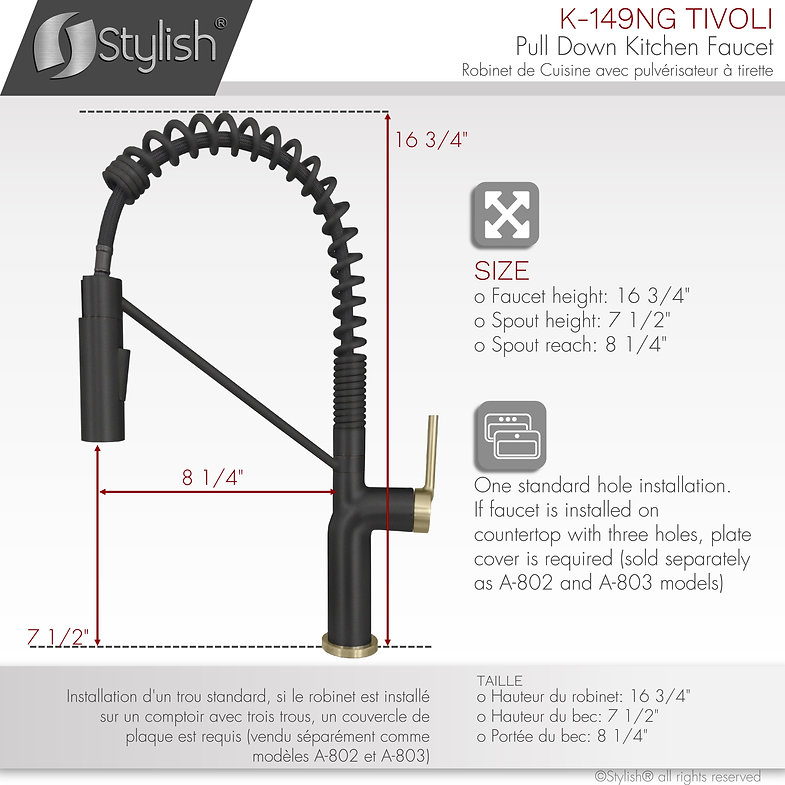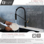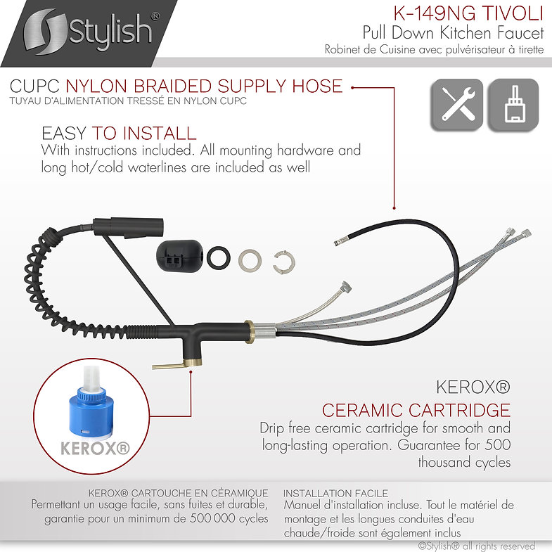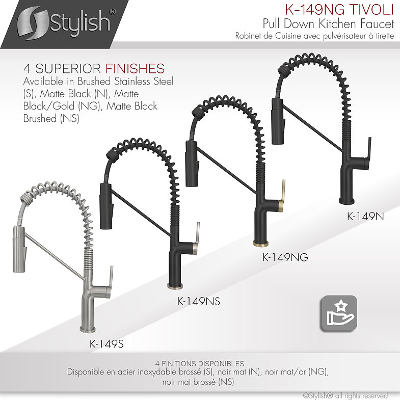 This faucet is made of 100% stainless steel and has been manufactured with top-quality components to ensure superior performance and durability. The pull-down, dual-action metal spray head on the single-handle kitchen faucet allows for your choice of aerated flow or powerful spray for all your kitchen needs. The 360° swivel spout extends up to 25″, and its spiral details make it a highly functional and beautiful statement piece.?This kitchen faucet is made of all solid stainless steel material and with high quality components ensuring lasting value and superior performance. One of the high-performance components is an ultra-durable Kerox ceramic cartridge which has been tested for over 500,000 cycles. Also, includes a Neoperl aerator that reduces the waste of water without sacrificing pressure. This commercial style kitchen faucet fits a standard 35mm hole. Easy to install with a single hole countertop design. Included with the pull-down kitchen faucet are the stainless steel braided cold and hot water hoses and installation instructions. Available in four finishes, brushed stainless steel, matte black/gold, matte black/brushed, and matte black. Make a bold statement and let your kitchen be the centre of attention when you install this commercial spring kitchen faucet, it will match any decorating style.